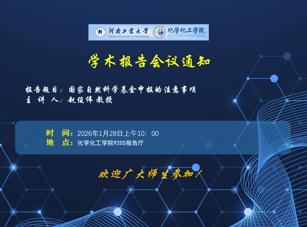报告题目:国家自然科学基金申报的注意事项报 告 人:赵俊伟 教授报告时间:2026年1月28日10:00报告地点:...