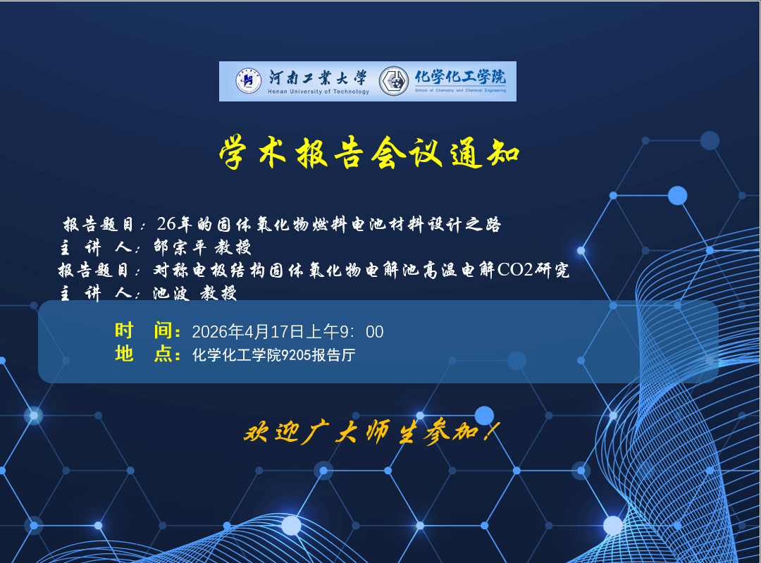 报告题目:26年的固体氧化物燃料电池材料设计之路报 告 人:邵宗平 教授报告时间:2026年4月17日9:00报告...