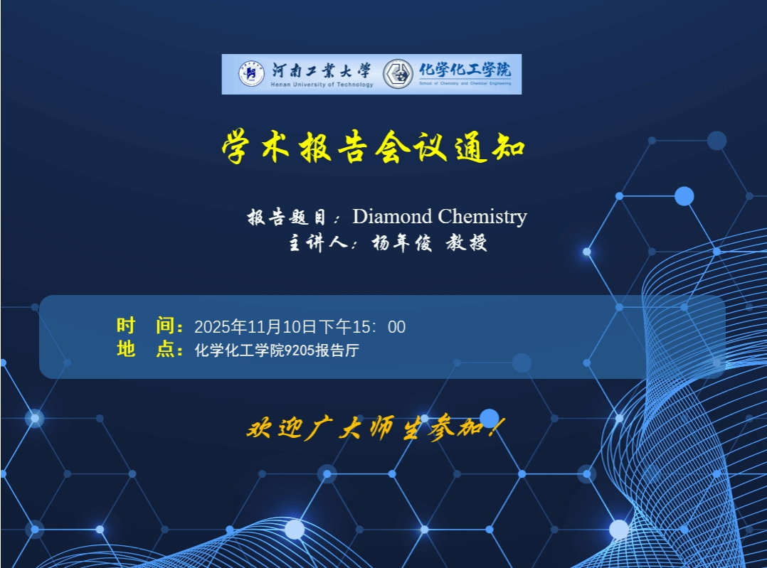 报告题目:Diamond Chemistry报 告 人:杨年俊 教授报告时间:2025年11月10日15:00报告地点:化学化工学院...