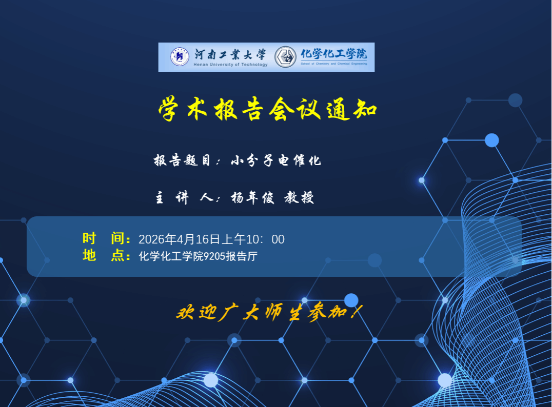 报告题目:小分子电催化报 告 人:杨年俊 教授报告时间:2026年4月16日10:00报告地点:化学化工学院9205报...