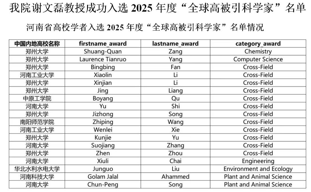我院谢文磊教授成功入选2025年度“全球高被引科学家”名单
