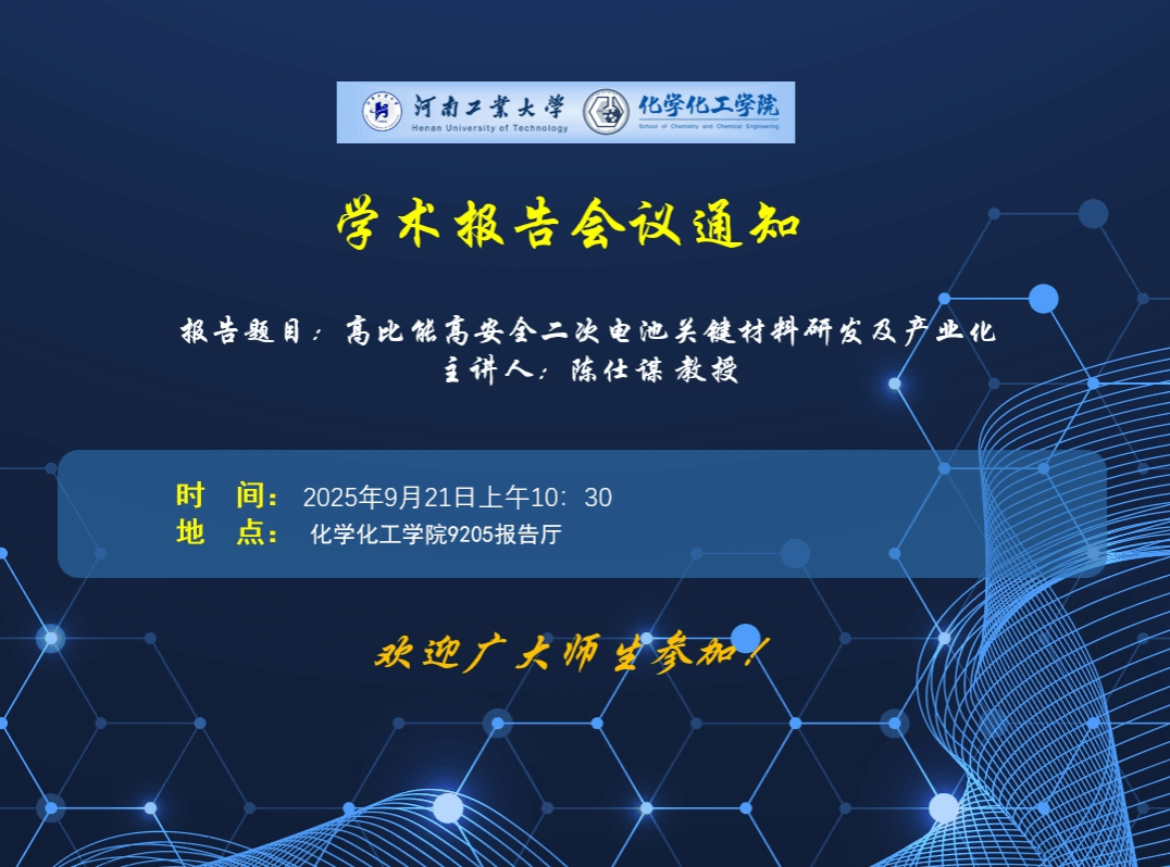 报告题目:高比能高安全二次电池关键材料研发及产业化报 告 人:陈仕谋 教授报告时间:2025年9月21日10:30...