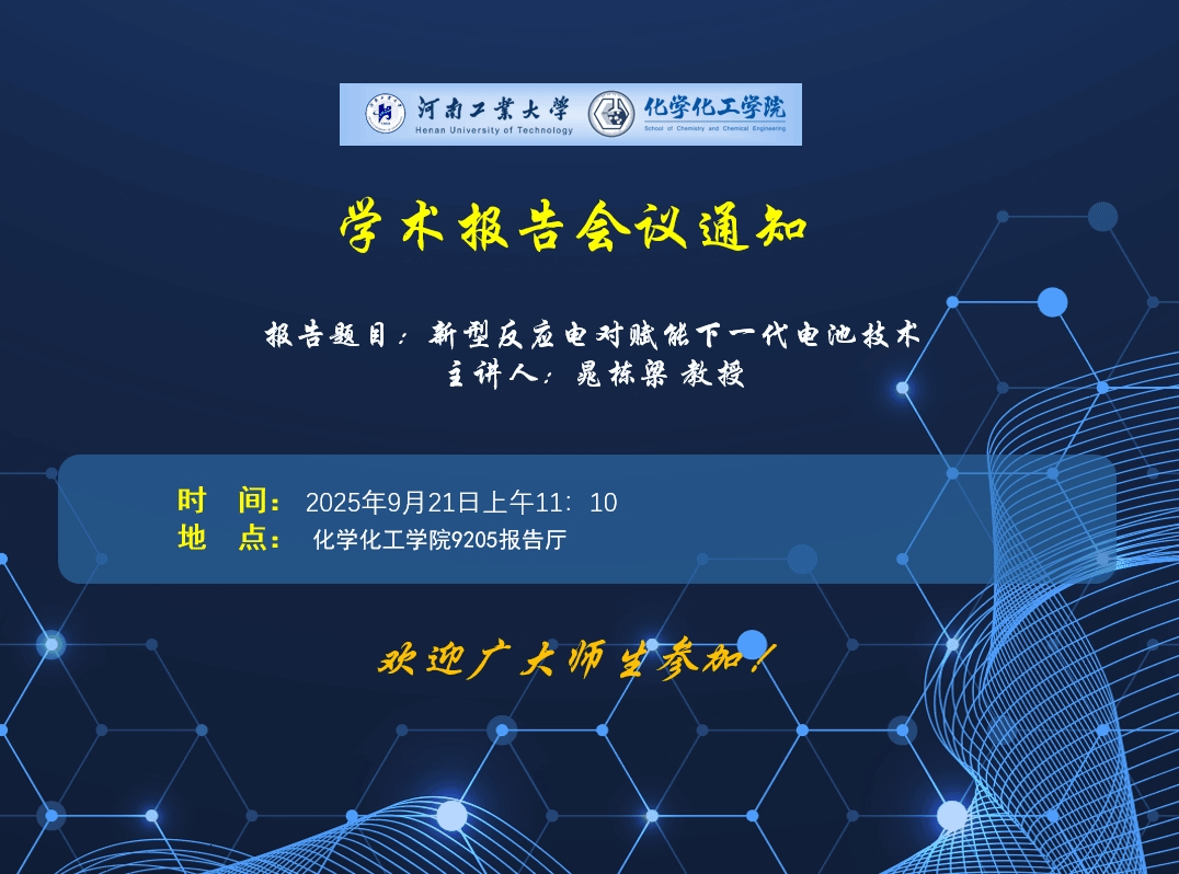 报告题目:新型反应电对赋能下一代电池技术报 告 人:晁栋梁 教授报告时间:2025年9月21日11:10报告地点:...