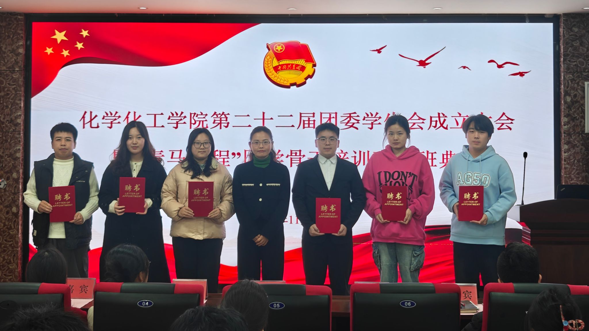 会议在庄严的国歌声中拉开帷幕。第二十一届团委学生会执行主席彭宇航围绕宣传引领、校园文化、社会实践、科技创新等方面,系统总结了2024年度学生会工作。随后,与会领导、老师为第二十一届团委学生会干部颁发聘书并合影留念。