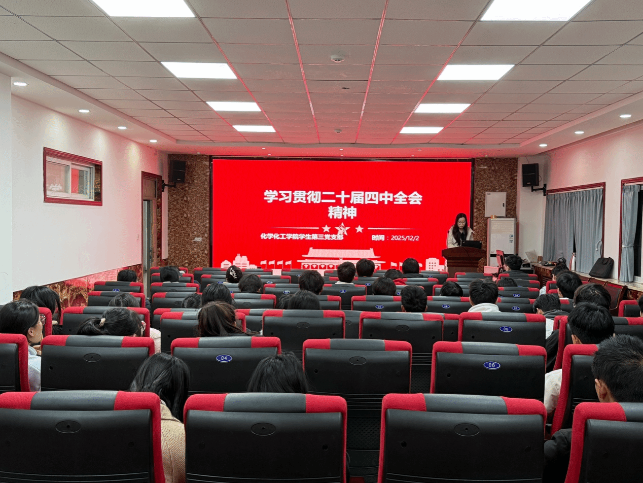 为深入学习领会第二十届四中全会精神,引导青年党员准确把握新时代党的使命与任务,2025年12月2日,化学化工学院学生第一、第三党支部联合在9205教室举办“学习贯彻第二十届四中全会精神,科技赋能推进中国式现代化”主题党日活动。支部全体党员、预备党员及部分入党积极分子参加了本次学习。