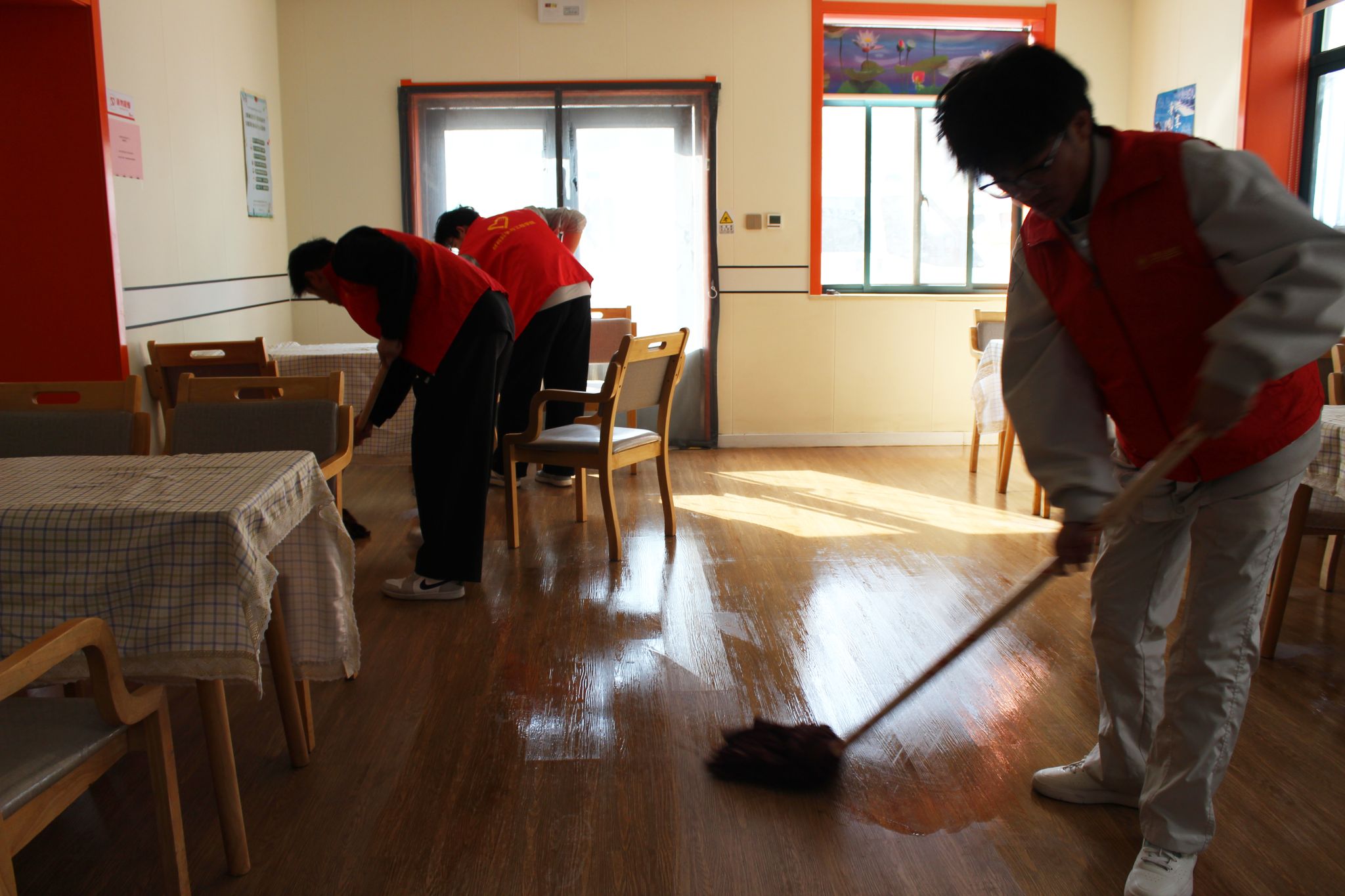 活动现场,志愿者们以饱满的热情和积极的态度投入服务。大家主动围坐在老人身边,耐心倾听老人们讲述过往的人生经历与岁月感悟,用亲切的交谈拉近彼此的距离,用真诚的陪伴驱散老人的孤单。随后,志愿者们分工协作,认真擦拭门窗、整理内务、清扫地面,为老人们营造干净整洁、舒适宜居的生活环境。