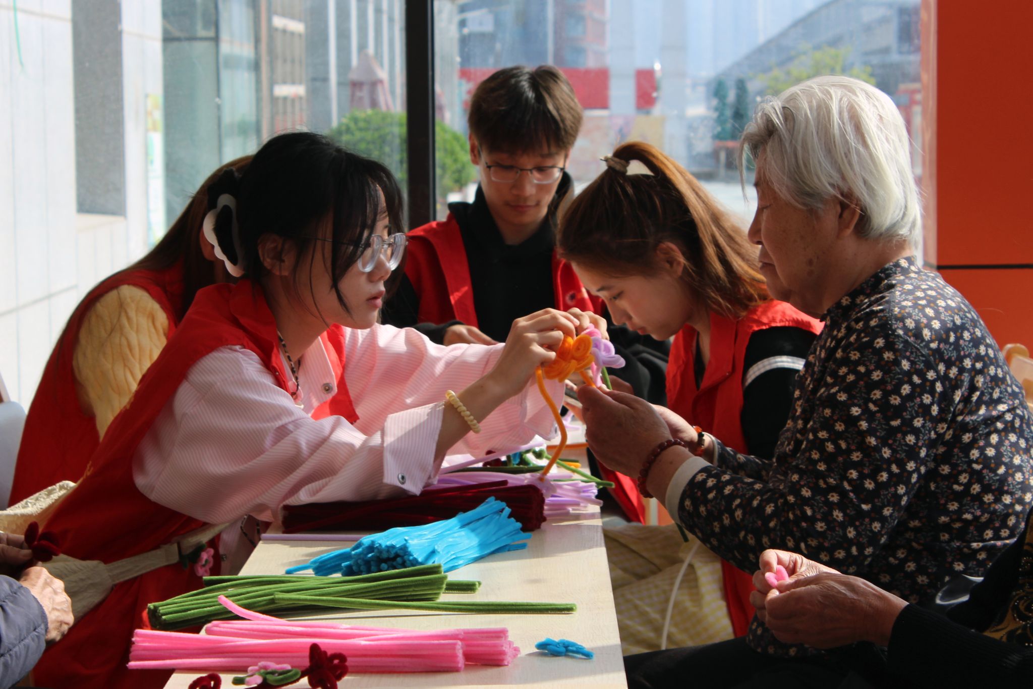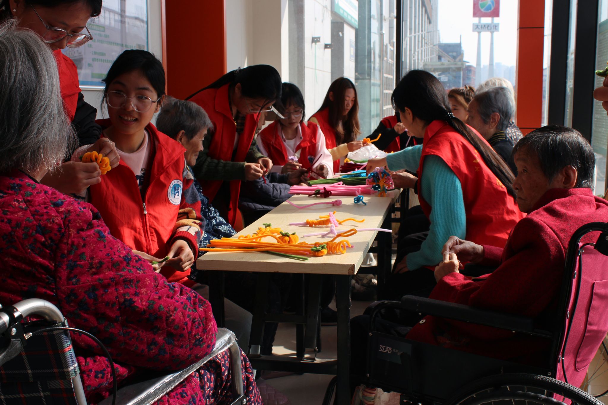 此外,志愿者们还精心准备了扭扭棒等手工材料,手把手带领老人进行创意手工制作。大家相互配合、交流心得,让老人们在轻松愉悦的氛围里,真切感受到来自青年学子的关爱以及社会的温暖。